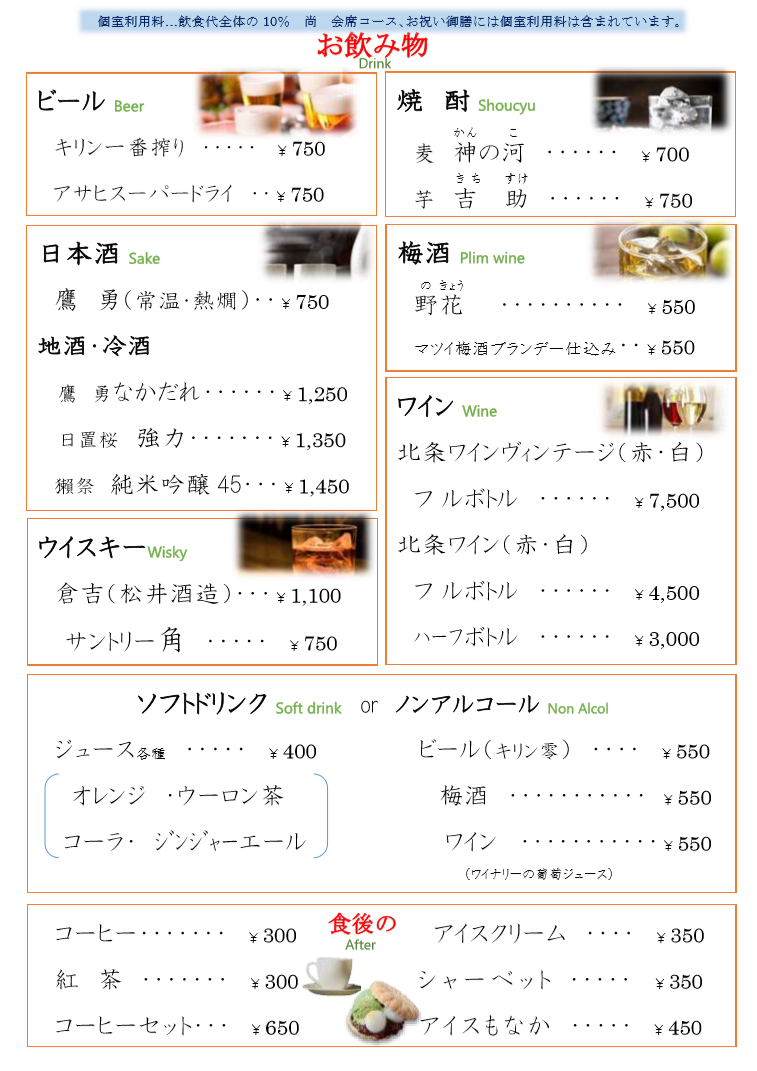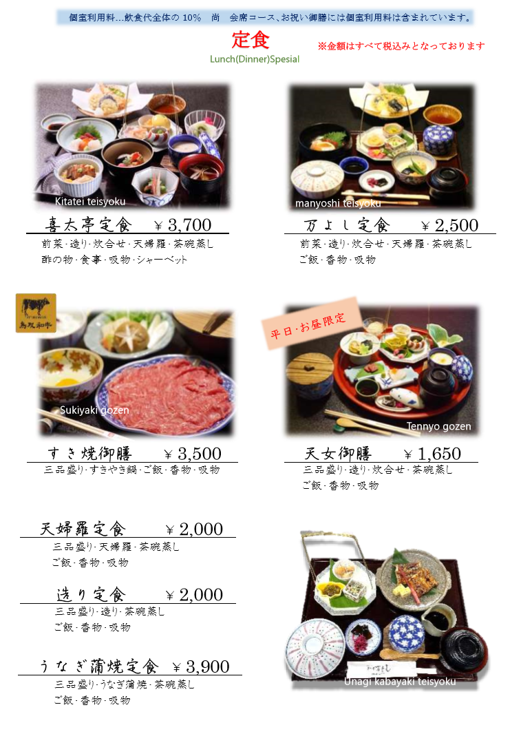 なお、お祝い御膳、会席コースの料金には個室料は含まれております。
